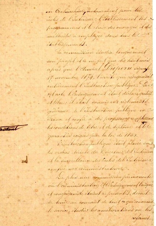 Chính vì vậy, ngay từ năm 1864, chữ Pháp và chữ Quốc ngữ được dạy song song ở trường học. Ở thời kỳ này chữ Quốc ngữ cũng đã bắt đầu được dạy trong nhà trường tuy thời lượng còn ít. Đến năm 1871, Dupré ra quyết định theo đó các học trò phải viết các bài khóa bằng chữ Quốc ngữ ở kỳ thi đọc và viết bằng tiếng Việt. Ngày 17.11.1874, đô đốc Dupré ra quyết định tổ chức lại hoàn toàn nền giáo dục quốc dân. Nền giáo dục này được tuyên bố là miễn phí và tự do, tuân theo qui định chung của giáo dục quốc dân ở Pháp.