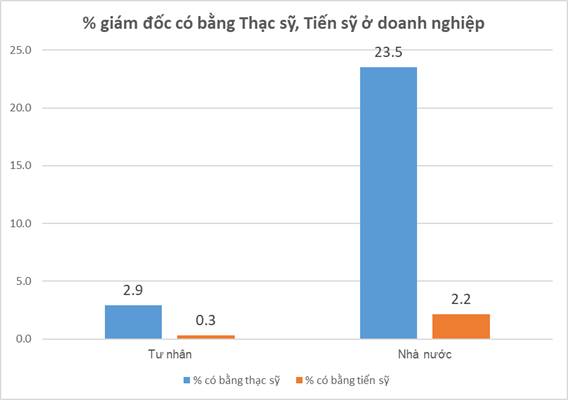 Hình 1: Dữ liệu Tổng Điều tra doanh nghiệp năm 2017 thì tỷ lệ giám đốc tốt nghiệp thạc sỹ và tiến sĩ ở các doanh nghiệp nhà nước cao gấp khoảng 10 lần so với các doanh nghiệp tư nhân.