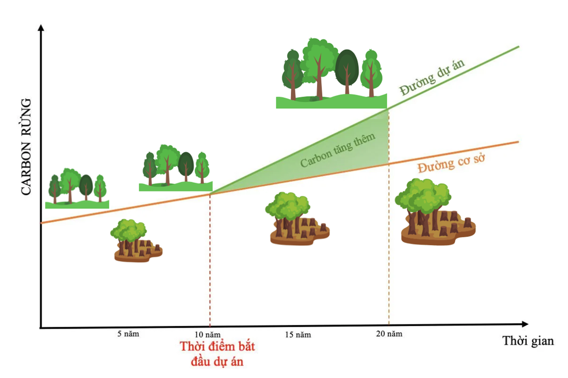Bằng các hoạt động dự án, khả năng hấp thụ và lưu giữ carbon của rừng gia tăng so với đường cơ sở được thiết lập bởi kịch bản phát triển thông thường (BAU) khi không có dự án. Trữ lượng carbon tăng thêm là nguồn để quy đổi ra tín chỉ carbon cho các giao dịch trên thị trường carbon nói chung.