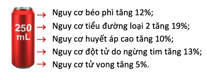 Đôi khi, chúng ta tự chiều chuộng bản thân mình và tự nhủ “uống một vài chai, vài cốc nước ngọt có hại gì đâu”. Nhưng các con số thực tế sẽ khiến chúng ta phải nghĩ lại. Các phân tích tổng hợp gần đây cho thấy, ngay cả việc tiêu thụ một chai nhỏ chừng 250ml đồ uống có đường hằng ngày cũng đủ sức làm tăng 12% nguy cơ béo phì, 19% nguy cơ mắc tiểu đường loại 2, 10% nguy cơ cao huyết áp, 13% nguy cơ tử vong do tim mạch tăng 13% và 5% nguy cơ tử vong do mọi nguyên nhân (Hình 1).
