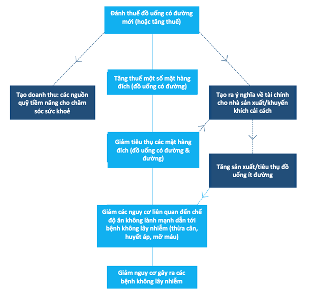 Có lẽ đọc tới đây ai cũng nhận thấy sự cần thiết của việc giảm lượng tiêu thụ đồ uống có đường. Nhưng bằng cách nào? Trên thế giới, hơn 60 quốc gia và vùng lãnh thổ đã giảm tiêu thụ đồ uống có đường và các ảnh hưởng tiêu cực từ sử dụng bằng nhiều chính sách, một trong số đó là đánh thuế các sản phẩm này nhằm giảm khả năng chi trả, từ đó giảm nhu cầu của người tiêu dùng, cũng như giảm gánh nặng bệnh tật do tiêu thụ nhiều đường.5 Lợi ích của việc đánh thuế tiêu thụ đặc biệt đối với đồ uống có đường đối với y tế công cộng được nhìn nhận từ ba khía cạnh khác nhau như mô tả trong hình 2.