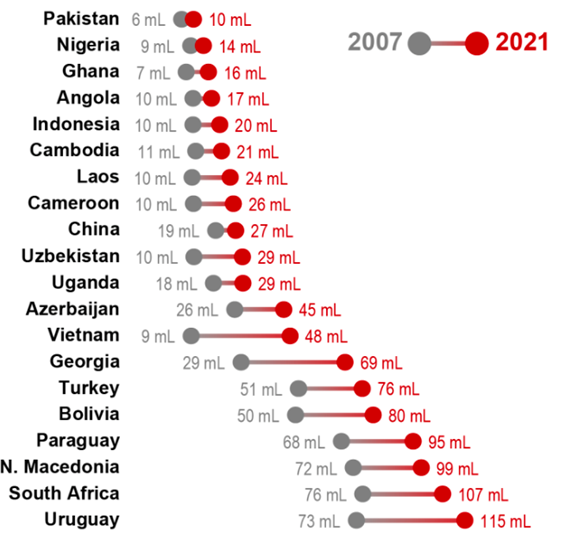Mức tiêu thụ bình quân đầu người của nước giải khát đóng chai ở Việt Nam đã tăng nhanh chóng từ 9ml/ngày vào năm 1997 tới 48ml/ngày vào năm 2021.
