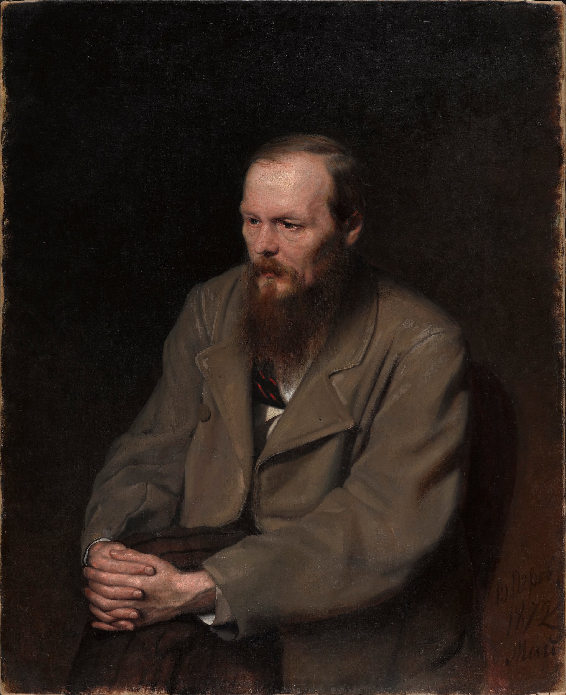 Trong số những bức chân dung trong cuộc triển lãm này, chân dung của Dostoevsky gây một cú sốc với người Anh, ngay cả những người từng ngắm những phiên bản của bức tranh. Nhà văn Nga nổi tiếng ngồi trong bóng tối, mái đầu quay nghiêng, ánh nhìn lảng tránh, vầng trán xương xẩu và nhợt nhạt. Năm 1849, ở tuổi 28, ông từng bị bắt giữ vì tham gia vào một tổ chức xã hội bí mật. Thoát khỏi án tử hình vào giờ chót, ông bị kết án bốn năm lao động khổ sai và năm năm phục vụ cưỡng bức trong quân đội, sức khỏe hoàn toàn suy sụp ngay trước khi trở về Moscow. Nếu như không biết gì về những điều ông phải hứng chịu – chân tay bị còng, làm việc trong trại lao động khổ sai ở Sibiri lạnh giá và trong lò lửa nóng bỏng, sống trong tình trạng cô độc, thiếu thốn và đói khát – bạn có thể thấy được tất cả điều đó trong chính bức chân dung tràn ngập cảm xúc câm lặng này. Họa sỹ tác giả – Vasily Perov, đã tạo ra một sự riêng tư hoàn toàn cho nhà văn, ông không nhìn chằm chằm vào họ, và cũng không có bất cứ ai có thể nhìn thẳng vào cặp mắt ông mà chỉ cảm thấy ánh mắt ông thiêu đốt trong lòng bóng tối.