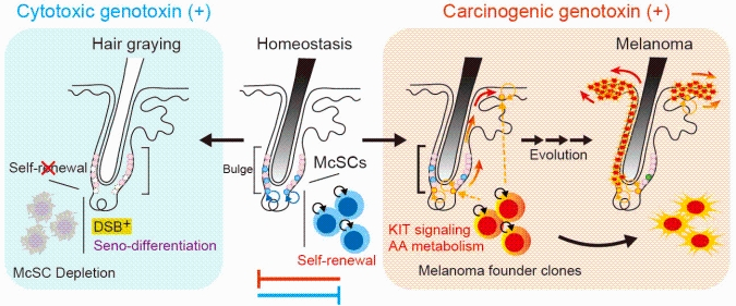 Tóc bạc và ung thư hắc tố da có thể là kết quả phản ứng của tế bào gốc trước những tổn thương DNA khác nhau. Nguồn: IMSUT
