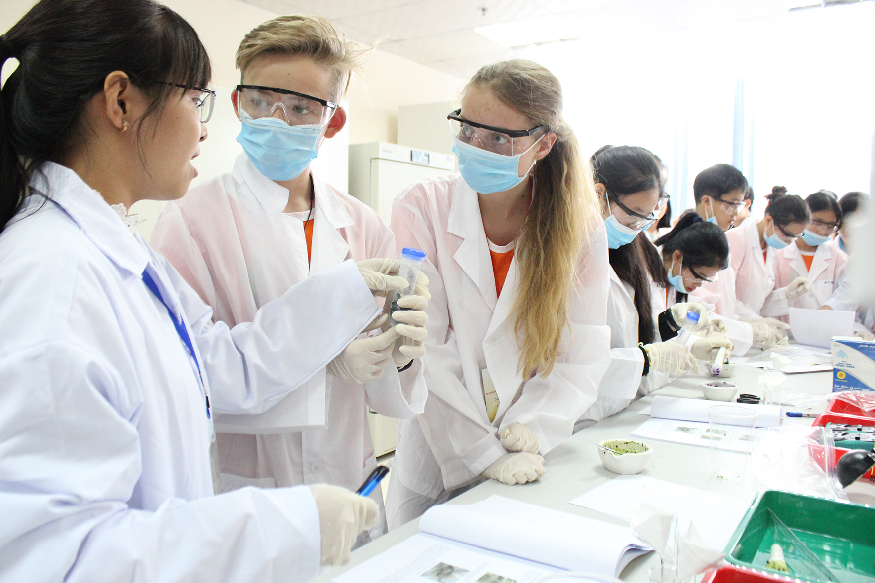 Nhóm thí sinh Thụy Điển đang làm thí nghiệm nghiền và thu dịch chiết lá cây.