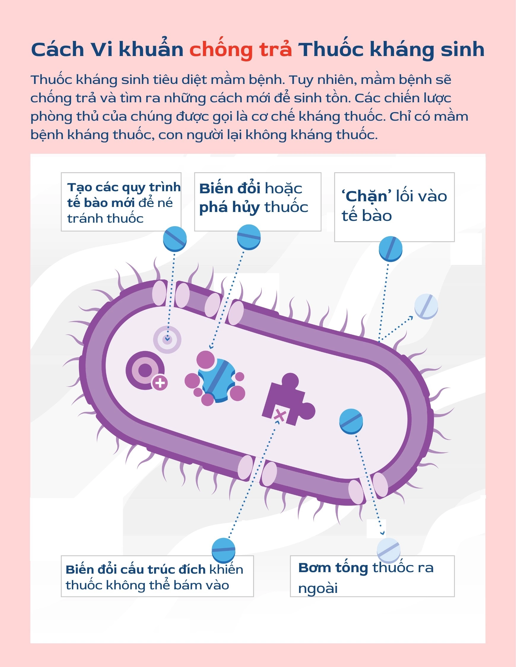 TS Nguyễn Trung Kiên giải thích, chiến lược thường thấy nhất là chúng tiết ra các enzyme để phá hủy cấu trúc kháng sinh, khiến thuốc không còn tác dụng. Một số vi khuẩn còn thay đổi lớp vỏ của mình để thuốc không thể xâm nhập vào bên trong. Ngay cả khi thuốc đã lọt được qua lớp vỏ, vi khuẩn vẫn còn một hệ thống "máy bơm đẩy" (efflux pumps) hoạt động liên tục để thải loại kháng sinh ngược trở lại môi trường, ngăn chặn việc tích tụ nồng độ thuốc đủ cao. Thậm chí, vi khuẩn có thể thay đổi cấu trúc bên trong của mình, khiến thuốc không còn khả năng nhắm trúng đích.