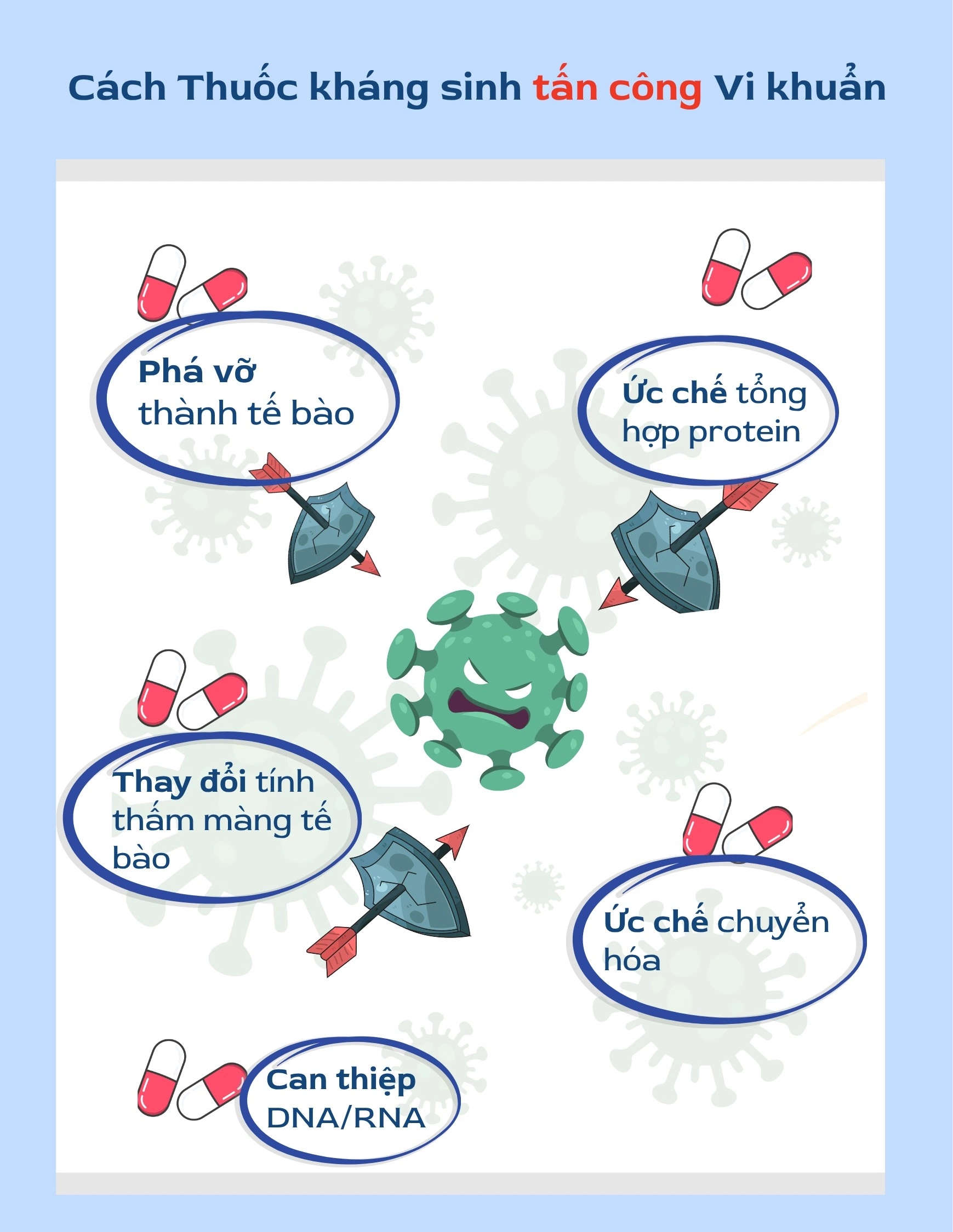 Kháng sinh có khả năng đánh vào những điểm yếu chí mạng của vi khuẩn. Một số loại trực tiếp phá hủy thành tế bào, khiến vi khuẩn không còn lớp bảo vệ và tự vỡ tan. Những loại khác lại thâm nhập vào bên trong để khóa bộ máy sao chép DNA hoặc ngắt dây chuyền sản xuất protein nuôi sống vi khuẩn. Khi các hoạt động sống cơ bản bị đình trệ, vi khuẩn không thể nhân bản và nhanh chóng bị tiêu diệt.