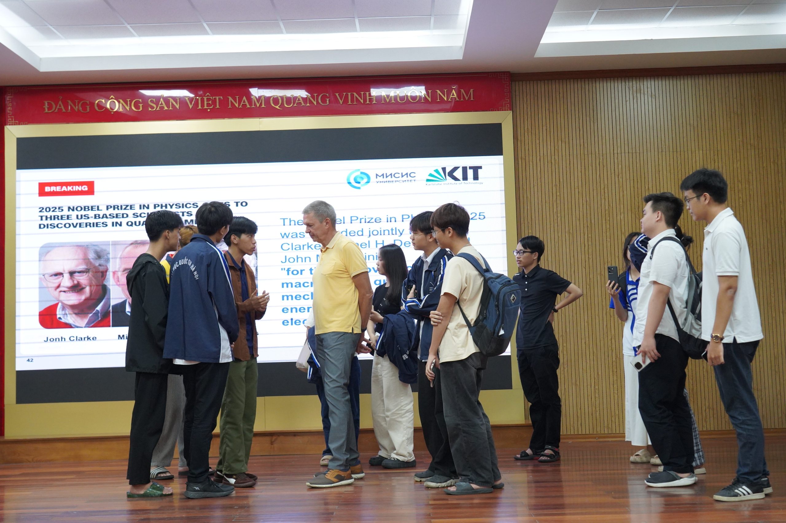 Dù chưa được hiểu hết nhưng vật lý lượng tử với những từ khóa “rối lượng tử”, “chồng chập lượng tử”, “uy quyền lượng tử”, “máy tính lượng tử”, “bit lượng tử”, “mật mã lượng tử”… đã dần trở nên quen thuộc ngay cả ở Việt Nam, nơi trình độ khoa học vẫn còn khiêm tốn với thế giới. Có thể tạm lý giải một phần nguyên nhân là “mưa dầm thấm lâu”, khi các tri thức bắt đầu từ “tháp ngà” học thuật lan ra xã hội, một phần là từ rất nhiều hội thảo, seminar như PIPC 2025 đã diễn ra kể từ đầu năm, trong đó chiếm không ít là những bài giảng đại chúng do Viện Vật lý (Viện hàn lâm KH&CN Việt Nam), Hội Vật lý Việt Nam, Viện Nghiên cứu cao cấp về toán, trường Đại học KHTN (ĐHQGHN) tổ chức với các chủ đề khác nhau… “Người tới nghe bài giảng đại chúng ‘2025 Nobel Prize in Physics – Hardware for Quantum Computers’ (Giải Nobel Vật lý 2025 – Phần cứng cho Máy tính Lượng tử) ở trường Đại học KHTN chật kín cả hội trường, gồm cả các bạn sinh viên trong và ngoài trường”, TS. Nguyễn Quốc Hưng, Viện trưởng Viện Công nghệ lượng tử (ĐHQGHN) cho biết. Cũng thật “may mắn” là diễn giả của sự kiện này, GS. Alexey Ustinov – Giám đốc Phòng thí nghiệm Công nghệ lượng tử siêu dẫn, trường Đại học KH&CN Quốc gia Nga (MISIS), “là đồng tác giả công bố với các nhà khoa học đoạt giải Nobel Vật lý John Clarke và John Martinis về hiệu ứng lượng tử vĩ mô trên mạch điện siêu dẫn, và là bạn thân của Michel Devoret”, TS. Nguyễn Quốc Hưng cho biết thêm – hai ông có cùng học trò về mạch điện siêu dẫn vĩ mô là GS. Wallraff ở Đại học Zurich ETH (PhD với Ustinov, postdoc với GS. Devoret Nobel).