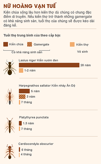 Thế nhưng kiến chúa lại có cả hai. Với một số loài kiến, kiến chúa sống thọ hơn 30 năm trong khi vẫn đẻ hàng nghìn nghìn trứng – sau này nở thành kiến thợ tương lai. Trái lại, những kiến thợ cái không có khả năng sinh sản chỉ sống trong vòng vài tháng. Trong trường hợp cần thiết, một số loài kiến thợ có thể đứng ra trở thành “kiến chúa giả” vì lợi ích chung của tổ, đồng thời kéo dài một cách đáng kể tuổi thọ của bản thân.
