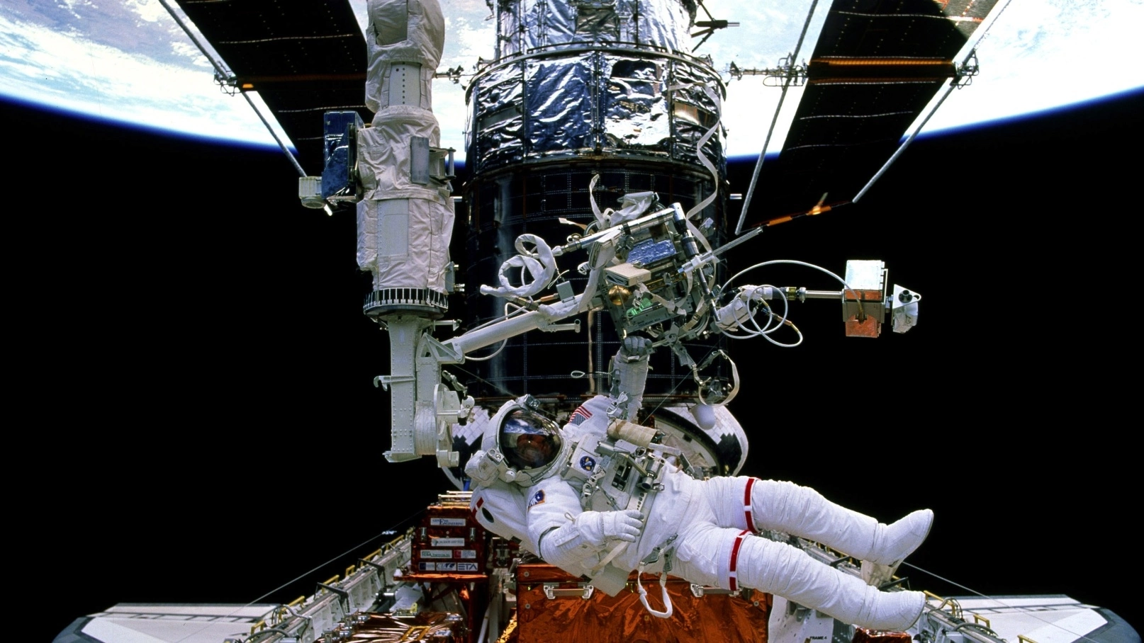 Phi hành gia Gregory J.Harbaugh đang làm việc trên Kính viễn vọng không gian Hubble trong nhiệm vụ nâng cấp nó vào năm 1997. Ảnh: NASA