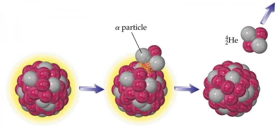 Hình 4: Phân rã alpha là một quá trình mà một hạt nhân nguyên tử nặng phát ra một hạt alpha (hạt nhân heli), dẫn đến một cấu hình bền vững hơn và giải phóng một lượng năng lượng. Hiện tượng này là kết quả của tác dụng đồng thời của lực hạt nhân mạnh và lực điện từ nhưng không làm thay đổi thành phần quark của các nucleon. Phân rã alpha là phân rã phóng xạ phổ biến nhất trong tự nhiên.