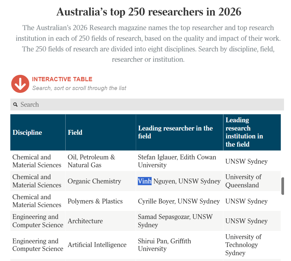 GS Nguyễn Thành Vinh (ĐH New South Wales), người nghiên cứu những phương pháp hóa học mới để tạo ra các hợp chất hữu ích cho y sinh, vừa được ghi nhận là nhà hóa học hữu cơ có ảnh hưởng nhất Australia.