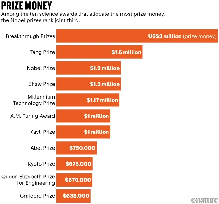 Trong nhiều năm qua, có nhiều giải thưởng đã được thiết lập để lấp đầy những khoảng trống đó. Một số thì có nhiều tiền thưởng hơn cả Nobel. Ví dụ, giải Đột phá được lập vào năm 2012, dành cho các lĩnh vực toán học, vật lý cơ bản và khoa học sự sống giải thưởng trị giá 3 triệu USD, dẫu không tránh khỏi cáo buộc là mượn danh tiếng của giải Nobel. Ngưỡng một triệu USD cũng là giá trị của các giải thưởng Tang, Shaw, Turing, Kavli và Millenium. Nhưng không giải thưởng nào hoàn hảo. Các nhà nghiên cứu có xu hướng làm việc nhóm và phần lớn các giải thưởng, không chỉ Nobel, đều chỉ chọn cá nhân để vinh danh.