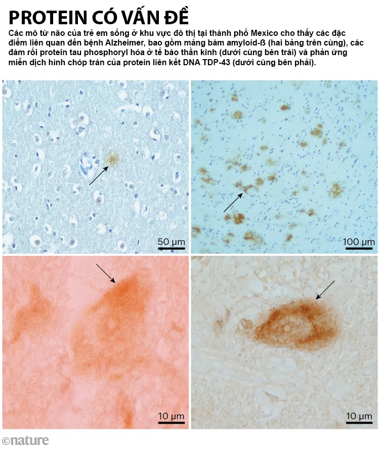 Các nghiên cứu về bộ não của trẻ em và chó ở Mexico City vào cuối những năm 2000 và đầu những năm 2010 là một trong những nghiên cứu đầu tiên gióng lên hồi chuông cảnh báo về độc tính thần kinh của ô nhiễm không khí. Ảnh chụp thần kinh cho thấy nhiều trẻ em sống ở thành phố ô nhiễm nặng bị tổn thương ở các đường dẫn chất trắng – các bó sợi thần kinh (axons) trong não tạo điều kiện giao tiếp giữa các vùng não khác nhau – so với trẻ em ở những khu vực ít ô nhiễm hơn, và phần vỏ não trước trán cũng dễ bị tổn thương hơn. Ngoài ra, trẻ em sống ở các thành phố ô nhiễm cũng thực hiện các nhiệm vụ nhận thức kém hơn, dù không có yếu tố nguy cơ nào khác về các rối loạn não.