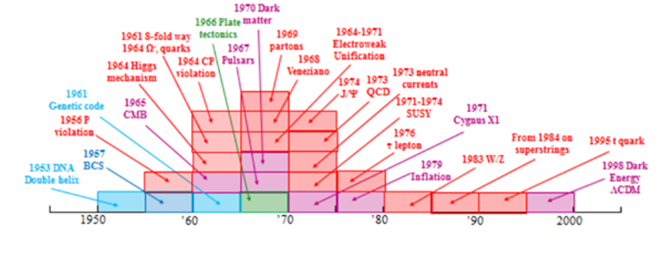 Hai thập kỷ 1955–1975 chứng kiến hàng loạt khám phá bất ngờ, mở đường cho các lý thuyết cách mạng. Ngược lại, 50 năm gần đây hầu như không mang đến khám phá bất ngờ nào. Chính sự chênh lệch này tạo nhiều suy ngẫm.