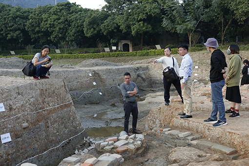 PGS.TS Tống Trung Tín, chủ trì cuộc khai quật năm 1998, và TS Nguyễn Ngọc Quý, chủ trì cuộc khai quật năm nay (lần lượt thứ 3, 4 từ trái sang), trao đổi với nhau tại hiện trường khai quật.