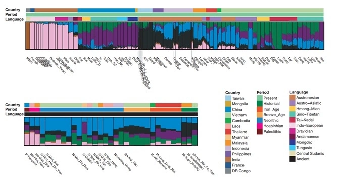 Bảng 1: Các dải màu sắc quy ước cho các tộc người trong biểu đồ này (màu giống nhau, chạy liên tục) cho thấy tình trạng "lai" giữa các dân tộc là hiển nhiên. Ảnh: Nhóm nghiên cứu cung cấp. |