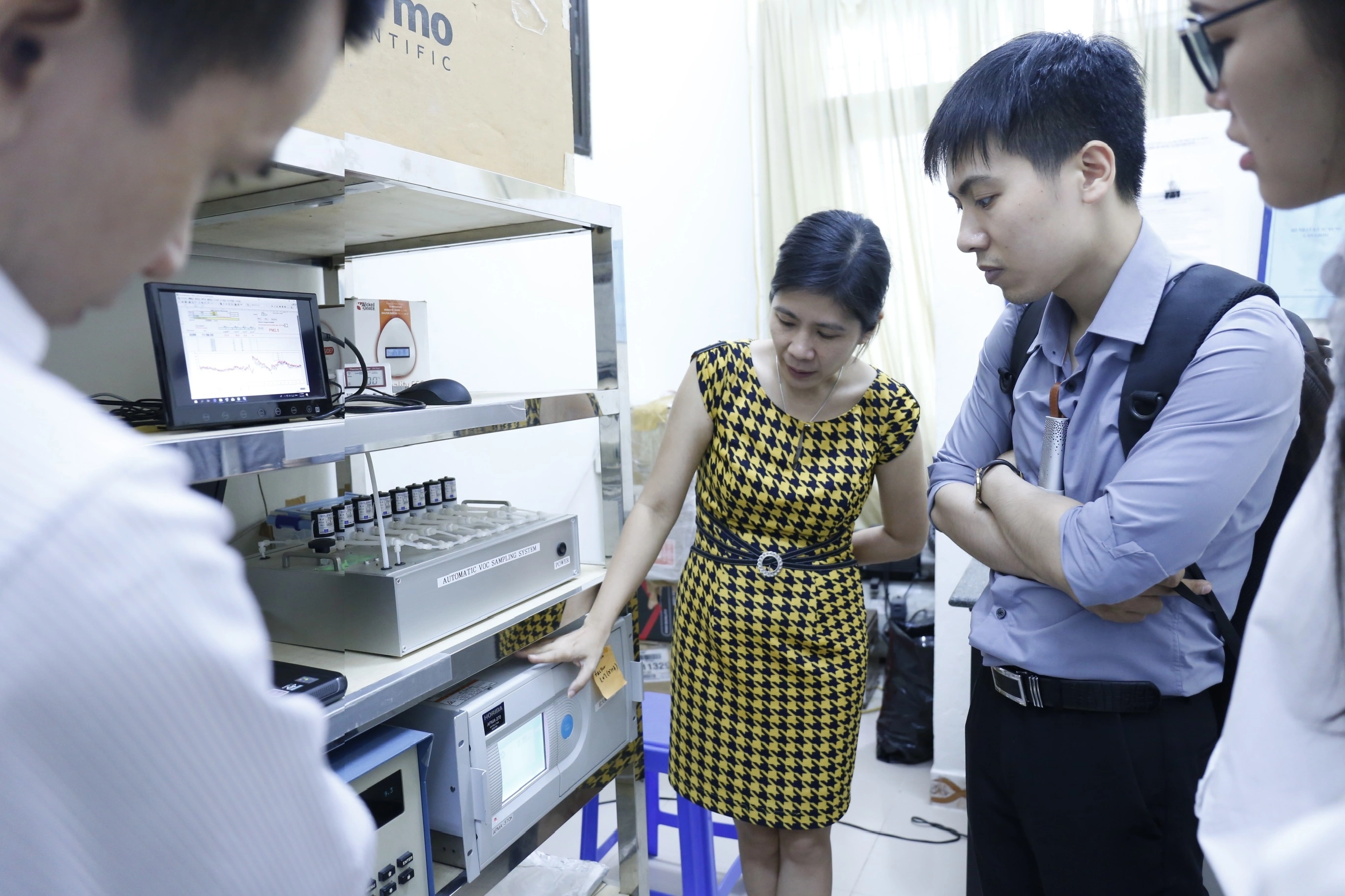 TS. Lý Bích Thủy (Viện Công nghệ môi trường, ĐH Bách khoa HN) giới thiệu một số thiết bị phân tích mẫu không khí trong phòng thí nghiệm. Ảnh: Nhật Hà