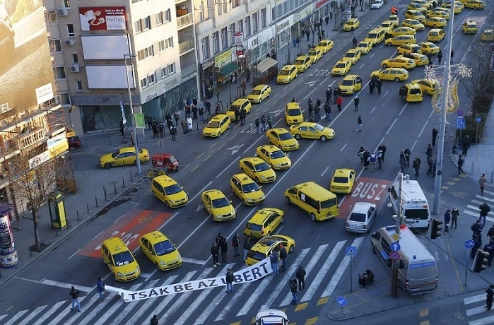 Các tài xế taxi truyền thống ở Budapest, Hungary dàn hàng trên đường phố để biểu tình phản đối Uber. Nguồn ảnh: Reuters