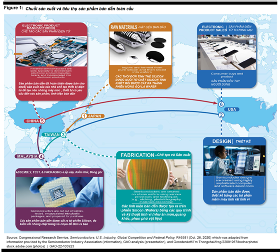 Ngành công nghiệp bán dẫn phân bố không đồng đều và bị chi phối bởi một số quốc gia, chủ yếu là Mỹ, Đài Loan, Hàn Quốc, Nhật Bản, Trung Quốc và châu Âu. Không có khu vực nào có toàn bộ dây chuyền sản xuất trên lãnh thổ của mình. Theo SIA, 57% vật liệu bán dẫn, 56% chế tạo tấm bán dẫn và 70% bộ nhớ đến từ các nước châu Á. Mỹ dẫn đầu về tự động hóa thiết kế điện tử (EDA), logic, thiết bị digital và tương tự. Sự phụ thuộc lẫn nhau sâu sắc này khiến bất kỳ quốc gia nào khó có thể duy trì vai trò lãnh đạo trong toàn bộ chuỗi giá trị toàn cầu. Đài Loan chiếm 92% sản xuất chất bán dẫn tiên tiến với công nghệ nhỏ hơn 10 nanomet. Căng thẳng thương mại hiện nay giữa Mỹ và Trung Quốc có thể sẽ ảnh hưởng đến hoạt động sản xuất chip ở Đài Loan. TSMC, nhà sản xuất chip theo hợp đồng lớn nhất thế giới, gần đây đã nêu ra trong báo cáo thường niên rằng cuộc chiến thương mại giữa hai nước có thể tăng giá cao hơn hoặc hạn chế khả năng tiếp cận các nguồn cung cấp chip cần thiết. Do TSMC nhận phần lớn nguồn cung từ Mỹ nên công ty có thể phải đối mặt với những thách thức trong việc tìm kiếm nguyên liệu thô cho sản xuất.