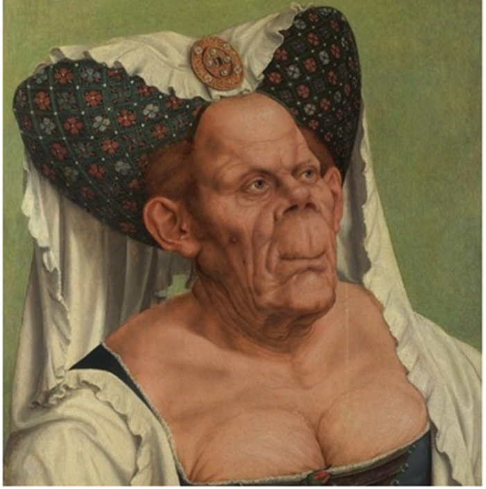 Bức chân dung Nữ công tước xấu xí hay còn được gọi là Bà già dị hợm ra đời năm 1513, của họa sĩ người Flemish Quentin Massys, có thể coi là một trong những bức họa nổi tiếng nhất của thời Phục hưng. Nhưng đây đồng thời cũng là một trong những bức tranh lạ thường và phi điển hình nhất cho thời kì này. Với làn da nhăn nheo, bộ ngực teo tóp, và đôi mắt trũng sâu trong hai hốc mắt, chủ thể nghệ thuật của Massys – được cho là một nhân vật hư cấu trong các truyện kể dân gian, hoặc một người đàn bà bị mắc chứng bệnh Paget (chứng bệnh về cấu trúc xương) cực hiếm – là một kẻ già nua cùng cực. Nhưng bà ta không chỉ già, trông bà ta còn dị dạng. Trán của bà ta gồ lên, mũi đã hếch hai lỗ mũi lại còn to tổ chảng, cái cằm quá khổ vuông bè bè bành ra hai bên. Ngay cả trang phục của bà ta cũng khác xa so với những gì chúng ta thường mong đợi ở một nữ quý tộc thời Phục hưng. Chưa hết, thay vì vận một bộ đồ trang nhã, khiêm nhường, bà ấy vận một bộ đầm trễ nải hở hang (với đường viền hở vai hở ngực và bộ ngực độn lên nhăn nhúm). Ở bà ta không có bất cứ một phẩm chất lí tưởng nào giống với các nhân vật nữ khác cùng thời như thần Vệ Nữ của Sandro Botticelli và nàng Mona Lisa của Leonardo da Vinci. Tuy vậy, bất chấp vẻ ngoài của bà, bức chân dung này (thường được gọi là Nữ công tước xấu xí) lại quyến rũ đến mức khiến người phụ nữ già ấy trở thành một trong những nhân vật khó quên nhất trong thời đại mình.