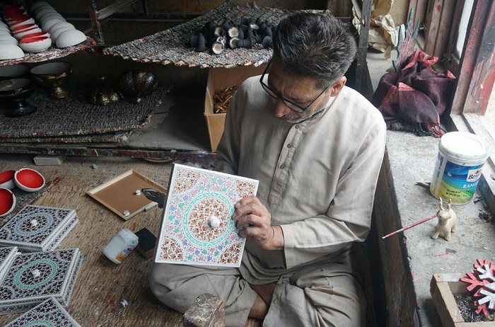 Barkat Ali, 50 tuổi, bước vào xưởng của mình ở Srinagar vào tám giờ sáng, tập trung vào việc vẽ các đường trang trí trên lọ, hộp và những đồ khác. Ông chỉ kiếm được khoảng ít hơn 300 rupe (3/3,50 USD) mỗi ngày. "Tôi không thể làm tiếp việc này nữa, tôi có hai con nhưng ở tuổi này rồi, tôi không thể học thêm nghề nào khác. Đó là lý do tại sao đến giờ tôi vẫn tiếp tục làm nghề", Ali nói.