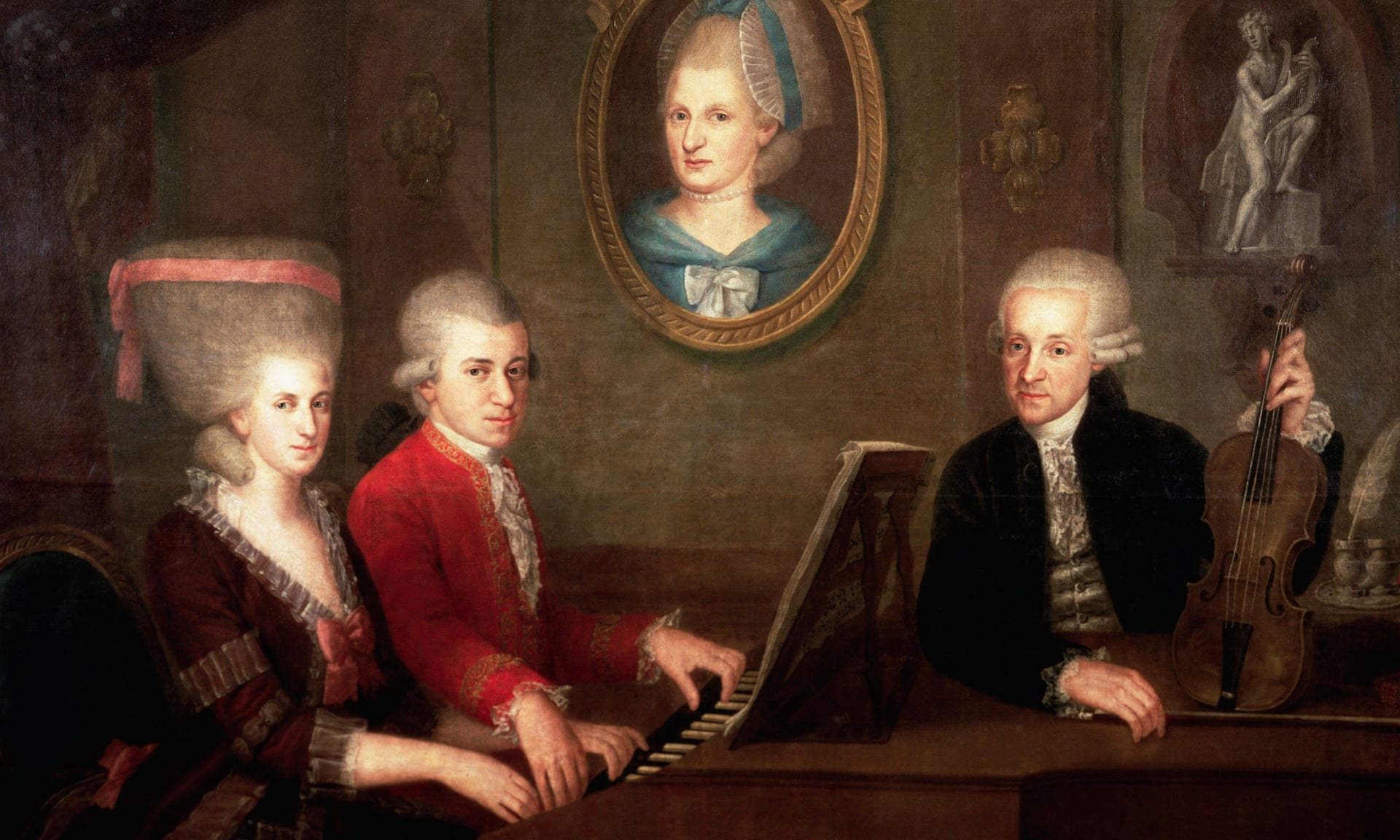 Wolfgang và chị gái Nannerl cùng cha là ông Leopold. Tranh của Johann Nepomuk della Croce