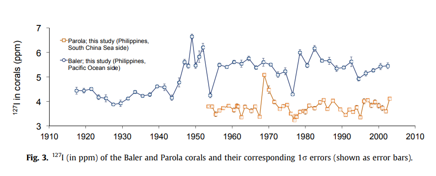Khi dùng kỹ thuật hạt nhân, phân tích các mẫu san hô lấy từ Baler và Parola trên máy khối phổ gia tốc AMS và quang phổ plasma ICP-MS đặt tại trường đại học Tokyo, Angel T.BautistaVII và cộng sự nhận thấy có sự tồn tại của iodine-129 – một trong những sản phẩm của phản ứng phân hạch hạt nhân như cesium-137 – trong mẫu san hô. “Tuy nhiên, chu kỳ bán rã của iodine-129 dài hơn nhiều so với cesium-137 bởi iodine-129 có thể tồn lưu trong môi trường 15,7 triệu năm trong khi chu kỳ bán rã của cesium-137 là vào khoảng 30 năm”, TS. Nguyễn Hào Quang, Viện Năng lượng nguyên tử Việt Nam (VINATOM), cho biết. Với chu kỳ bán rã này, có thể coi iodine-129 như đồng vị bền.